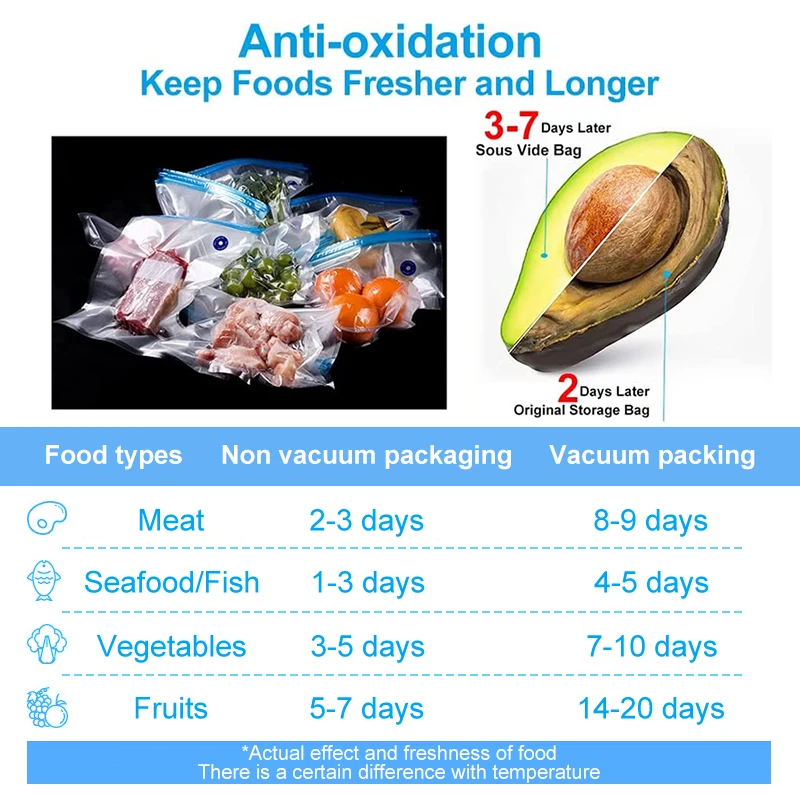 🍅 Food safe and BPA free material: reusable vacuum food storage bags are BPA free and made of high quality food safe material. Can be used for meat and seafood, vegetables, fruits, cereals, nut snacks and sandwiches, etc.